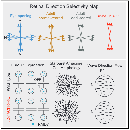 Summary data from Tiriac et al ,2022 showing the development of horizontal direction selectivity is dependent the presence of cholinergic retinal waves